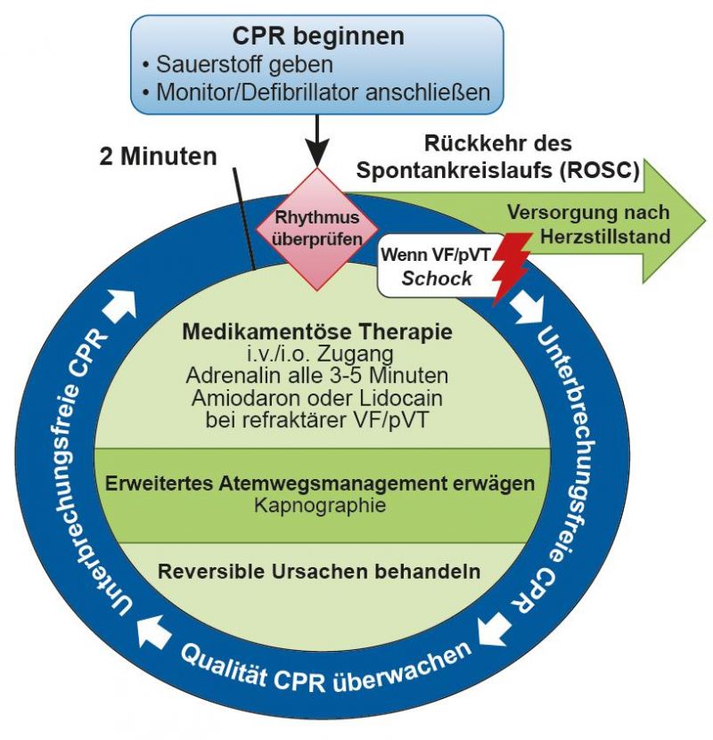 Während der laufenden Wiederbelebung werden die reversiblen Ursachen, die 5 H und 5 T abgearbeitet und ggf. eine zielgerichtete Therapie in Bezug auf konkrete reversible Ursachen eingeleitet.